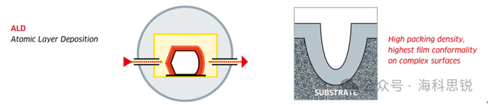 ALD基于顺序、自限性、逐层沉积。固体薄膜是由基材表面上发生的前体分子气相之间的化学反应形成的,通常会预热(150-350°C)以热引发该反应。