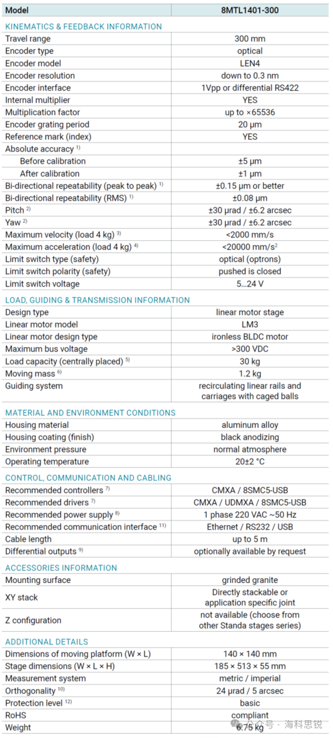 附1:立陶宛Standa公司直驱电动位移8MTL1401-300:主要性能参数:立陶宛Standa公司8MTL系列电动位移台基于三相无铁心直线无刷伺服电机技术。其直驱技术可实现零背隙运动,具有高精度、高重复性和低摩擦力的特点。8MTL系列电动位移台采用线性非接触式光学编码器作为反馈系统,可确保以亚纳米级运动分辨率实现位置的直接控制。经天然时效处理的铝合金保证了8MTL仪器的高温稳定性、柔顺性,以及导向系统无漂移的长期优异运动学性能。该位移台结构紧凑,可集成到高密度设备及狭小空间应用中。8MTL系列位移台可根据需求定制适用于洁净室和真空环境(最高10⁻³ Torr)。如需更高真空度要求,请联系Standa技术支持。若有特殊的洁净度要求,请另行说明(请在产品询价中注明)。该电动位移台可直接连接至标准英制/公制光学平台。XY扫描位移台无需使用连接板即可直接组装。若对正交性有极高要求,可向Standa技术支持提出额外申请。8MTL系列电动位移台的运动控制可通过Standa或ACS运动控制器与驱动器实现。针对轻工业应用,8MTL位移台可安装于标准光学平台或超平花岗岩平台上供货。
